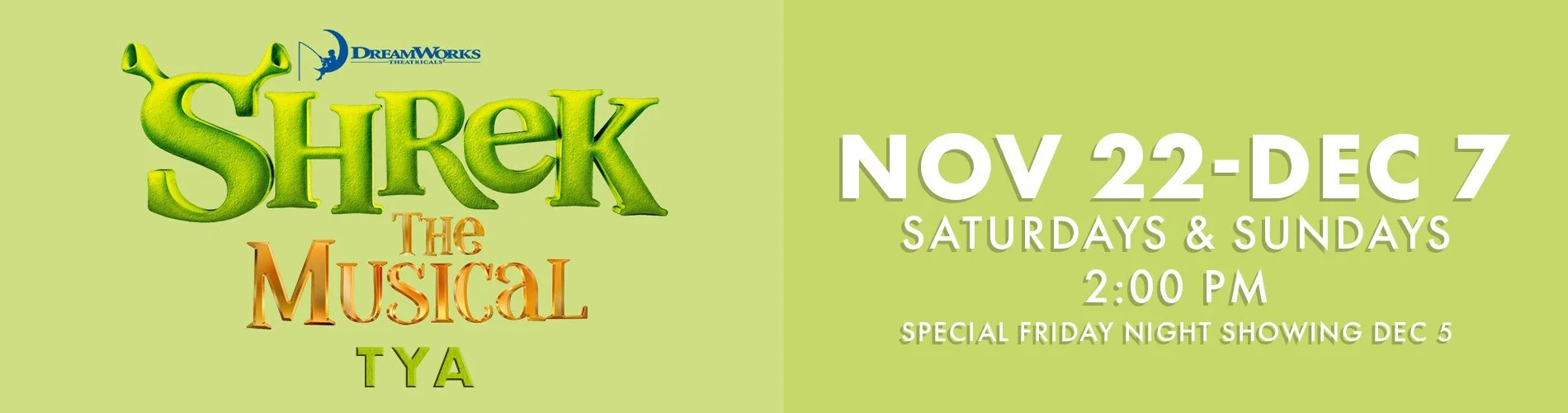 Shrek the Musical, TYA: November 22th-Dec 7th. Special Friday night showing on Dec 6th.